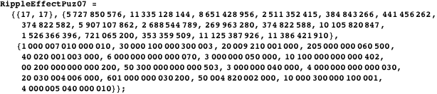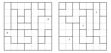 Ripple Effect was first published in Puzzle Communication Nikoli in May 1998 [1]. In these puzzles, a grid is divided into polyomino-shaped rooms.