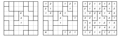 Here is a solved example puzzle. The first grid is the puzzle itself. In the second, some preliminary logic has been done. To start, all single squares need a 1. Ones cannot be adjacent, which forces a few more placements. The square marked “A” cannot be a 2, since the domino above it could not be filled. With further logic, the entire puzzle is solved.