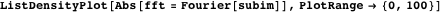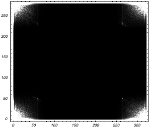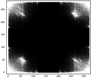 Because the dithering has a high spatial frequency, we suspect these frequencies to be higher than most of the other frequencies in the image. We compute the Fourier spectrum of the input image and plot its absolute value. Because the origin is really large, the image is automatically scaled with a large factor, which reduces the contrast. We zoom in on a limited range (
