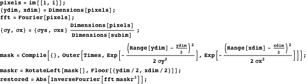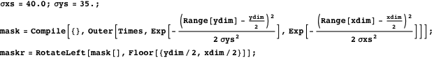 directions. The standard deviations have to be estimated from the 2D plot of the spectrum. For speed, we exploit the separability of the 2D Gaussian kernel. We first make two 1D arrays of Gaussian values and then multiply them into a matrix with Outer in a compiled function. This is about 140 times faster than a 2D Table command.