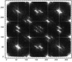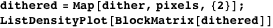We map this onto every pixel and get an image that is 16 times larger with dithered points. The function BlockMatrix (available in LinearAlgebra`MatrixManipulation`) combines the different submatrices.