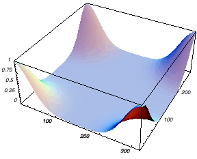 directions), which is then shifted over half the image size in each dimension to put the kernel at the origin of the Fast Fourier Transform (FFT) domain, which is in the lower left. Note that the Fourier domain is periodic in either dimension, so we actually see a single tile of a whole tiled 2D space in the