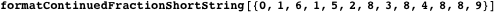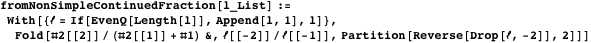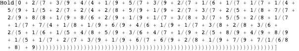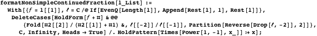 We start by defining functions to format continued fractions. The function formatNonSimpleContinuedFraction formats a list of integers as a nonsimple continued fraction. To avoid autoevaluation of the result to a single rational number, we use HoldForm.