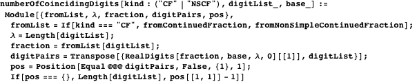 The function numberOfCoincidingDigits calculates the number of coinciding digits in the continued fraction and base