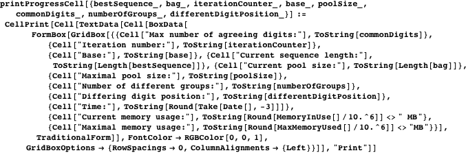 In this section we implement the main search function. Some of the searches we carry out run for many hours or even days. So, to see some progress, we define a function, printProgressCell, that prints the current state of the search.
