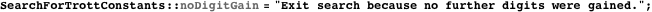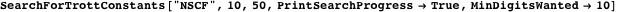 The function SearchForTrottConstants searches for a Trott constant in base base starting with the initial sequences initialSequences. Options for this function are: RecordSearchHistory, which determines if the maximal number of coinciding digits as a function of the iteration number should be recorded through the function searchHistoryData; AllowZeroDigits, which determines if 0 is allowed as a digit; PrintSearchProgress, which determines if cells showing the search progress should be printed; MaxIterations, which determines the maximal number of iterations; and MinDigitsWanted, which determines the minimum number of digits that agree that are wanted.