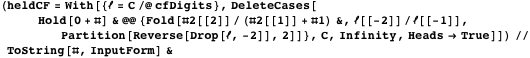 We will implement an expanded version of the program that calculated heldCF and use it to find various numbers (which MathWorld‘s creator Eric Weisstein calls “Trott’s Constants” [1]) whose simple or nonsimple continued fraction approximation agrees with their base