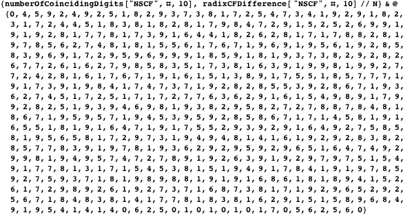 . This Corner implements a search method for such numbers and lists its results. The best number we found has more than 400 digits in common between its nonsimple, zero-free continued fraction representation and its radix representation.