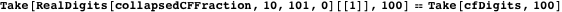 The first 100 digits of the continued fraction and the decimal expansion are identical.