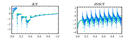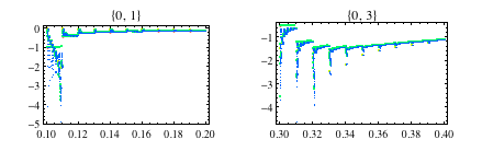 The second graphic shows the partially periodic, fractal-like behavior of the differences. For these short sequences, we can obtain a few coinciding digits for 0.1… and 0.3… for simple continued fractions. The next graphics zoom into these areas.