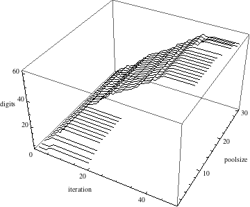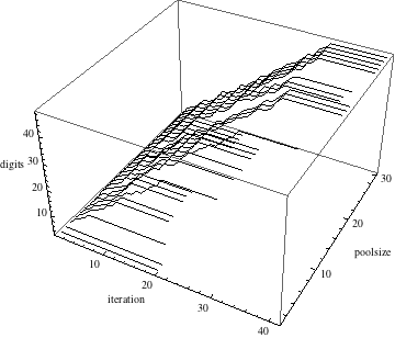 And here is the equivalent of the last calculation for nonsimple continued fractions. Again we use a pool size of 1000. This time, we obtain more than 100 identical digits. And again we see on average a linear increase in the digits gained as well as convergence on one final number (after about 40 iterations).