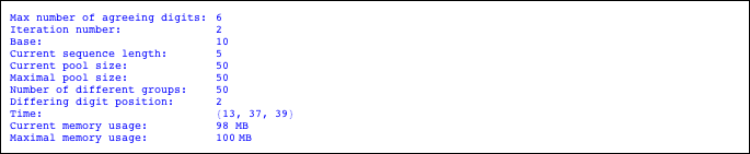 We achieved about 60 coinciding digits in about 15 minutes. The next three graphics show the number of coinciding digits of the optimal sequence, the number of different groups of sequences with different initial six digits, and the position of the first different digit across the pool of sequences as a function of the iteration number. We see that on average we gain a constant number of digits per iteration as long as we gain digits. We also see how the numbers in the pool converge towards a single number.