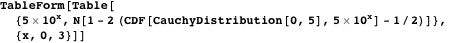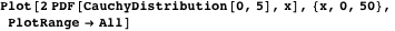 For the Cauchy distribution the probability that a spreading organism will come to rest per unit of distance, decreases with distance. For the following example where the median spread distance is 5 units, more than 6% of the organisms travel a distance greater than 50 units and more than