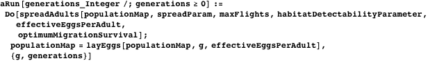 populationMap is the map; spreadParam, maxFlights, habitatDetectabilityParameter, effectiveEggsPerAdult, and optimumMigrationSurvival are predefined parameters that affect the rate of buildup of populations and movement of individuals.