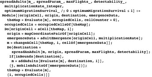 The function changeACell is an operator on the map data type that replaces the cell at position i in the cellList of the map. The function spreadAnAdult is evaluated for each mobile adult. It makes use of the function flightPath described in the Spread of Insects section and returns the mapCoordinatePair of the endpoint of the migration path. If the insect dies, nowhere is returned. New cells are added to the map during this process. The function inBounds returns True for any mapCoordinatePair that is not nowhere or outOfBounds. The function addAdults adds 1 to the newMobileAdults of the cell destination of the map.