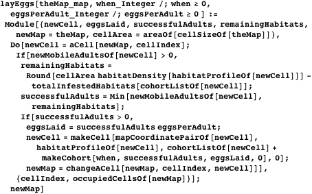The function layEggs calculates the number of remaining unoccupied habitats in each cell. The number of newly infested habitats is the least of the number of remaining uninfested habitats and the number of mobile adults that have landed in the cell.