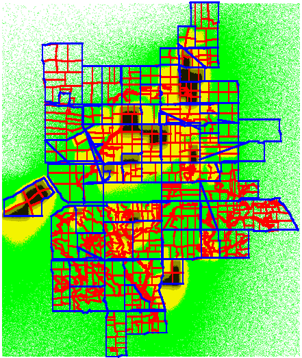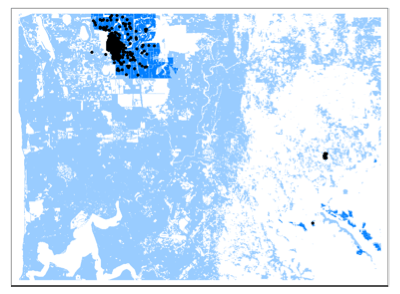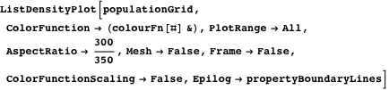 The following is an example that illustrates the use of ListDensityPlot to produce plots of population density of an organism with an overlay of boundary lines imported from a Geographic Information System (GIS). The population density data represents a 300 by 350 grid of 50m square cells. The raw GIS Data was imported from an ASCII file using the function