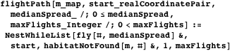 A function using NestWhileList that produces a sequence of flights as a list of realCoordinatePair endpoints can be implemented as follows; the function fly returns a realCoordinatePair endpoint from a starting point and a median spread distance, and the function habitatNotFound returns True if a habitat is not found and False otherwise.