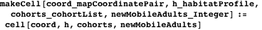 The function cellSizeOf is a selector of the map data type. The function areaOf is a selector of the realCoordinatePair data type that returns the product of the coordinates. The functions newMobileAdultsOf, habitatProfileOf, and cohortListOf are selectors of the cell data type. The function habitatDensity is a selector of the habitatProfile data type, and the function totalInfestedHabitats is a selector of the cohortList data type that returns the sum of habitatsInfested from the cohorts.