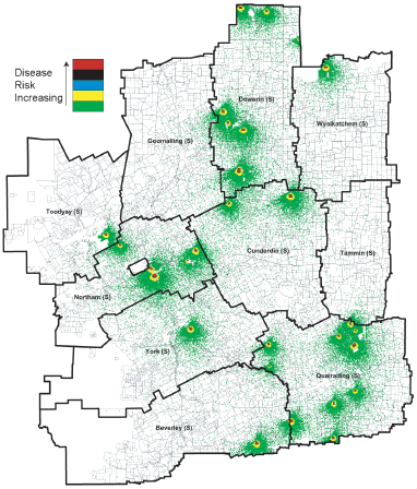 Figure 9. Sites of infestation after Generation 9 of simulated spread of European House Borer near Perth, Western Australia.
