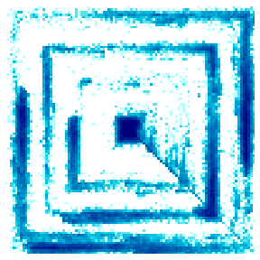 Figure 3 shows the simulated distribution of the weed Bedstraw in a 1km square field 11 years after an initial incursion of 100 randomly placed seeds. In each year the harvester followed a counter-clockwise spiral path from the lower right corner to the centre and then travelled diagonally back to the starting point. Shading is proportional to the density of the seed.