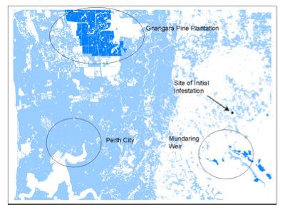The landing on the edge of the Gnangara pine plantation produced the first successful infestation remote from the initial infestation (Figure 7).
