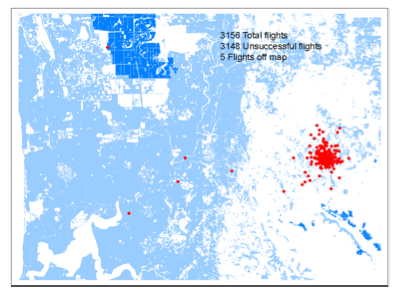 In early generations the insect population built up gradually. Most series of flights ended near the site of the original infestation, but in a few cases beetles travelled many kilometres. In Generation 5 one beetle landed on the edge of the Gnangara pine plantation (Figure 6). Total flights, Unsuccessful flights, and Flights off the map refer to series of flights rather than individual flights within a series.