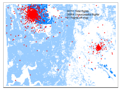 Figure 8. Endpoints of flights in Generation 9 of simulated spread of European House Borer near Perth, Western Australia.