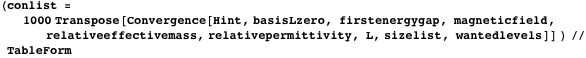 The Convergence function takes submatrices of the Hamiltonian using different basis sizes as specified by the input sizelist and calculates the energy of the levels specified by wantedlevels. The ground state is specified by 1, the first excited state by 2, and so on. This allows the convergence properties of the solution to be ascertained.