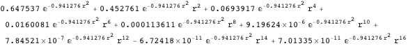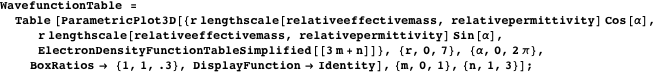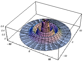 Next we use ElectronDensityFunction to convert the normalised energy eigenvector into a probability density function by combining it with the basis basisLzero. This is then simplified to cancel out the complex components. As the density function is a measurable quantity, we are guaranteed that the complex components will cancel. Chop is used to remove any complex components that remain due to rounding.