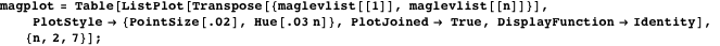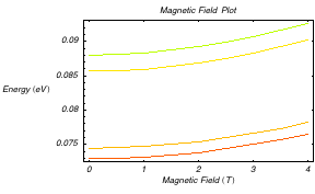 Note that although we are plotting six levels, two pairs of these remain degenerate as the magnetic field changes, so we only see four lines in the plot. Running the program several times, it is possible to plot curves with different spin quantum numbers and total orbital angular momentum quantum numbers on the same graph. From this, it is possible to see the graphs for different quantum numbers intersecting as the magnetic field increases. This corresponds to magnetic transitions in the energy levels. Magnetic transitions in the ground state of quantum dots have been measured experimentally.