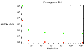 We can then calculate the energies of the ground state and first excited state as we increase the basis size. The energies are in meV.