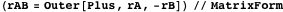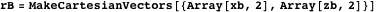 As an example of using the data type, specify two collections of two-dimensional vectors, and compute the collection of displacement vectors from each vector in one group to every vector in the other group. This is a computation common to many n-body problems. The constructor for the data type is MakeCartesianVectors.