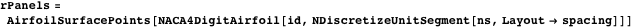 pieces. A layout option for this function allows constant spacing (default), cosine spacing, or half-cosine spacing. Cosine spacing provides finer discretization near the leading and trailing edges of the airfoil compared to constant spacing, and half-cosine spacing provides even finer discretization near the leading edge, but coarser discretization near the trailing edge compared to constant spacing. The function NACA4DigitAirfoil computes a list of thickness and camber properties at the