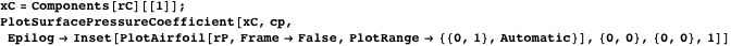 values, and the function AirfoilSurfacePoints computes the collection of vectors locating points on the surface of the airfoil from the list of thickness and camber properties. These points on the surface of the airfoil serve as panel end points for the discretized airfoil. Note that the result is expressed as the data type CartesianVectors as indicated by the arrow separating the lists of components.