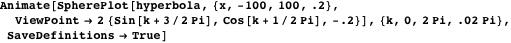 In this animation, a hyperbola appears as a one-branched figure-eight curve on the sphere.