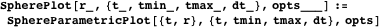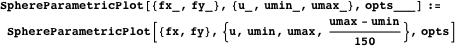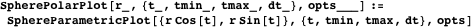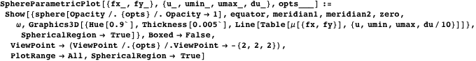 The first argument to SphereParametricPlot is a pair of functions. The first argument to SpherePlot or SpherePolarPlot is a single function. The second argument to all three functions is a range specification. A ViewPoint option may be given.