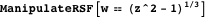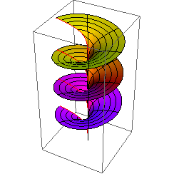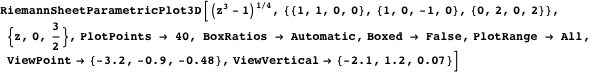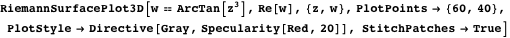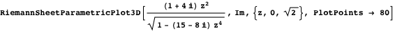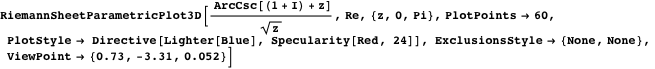 Now we will use new features of Plot3D and ParametricPlot3D to construct a Riemann surface. Using these 3D plotting functions on a function that has branch cuts, we now automatically get cuts along the branch cuts.
