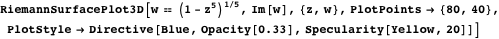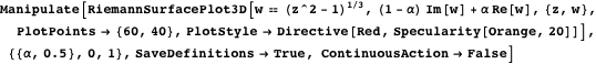 In earlier columns, I started discussing the visualization of Riemann surfaces. In this column, I want to come back to this mathematically (and aesthetically) beautiful subject. So far, we discussed the construction of Riemann surfaces of compositions of elementary functions with finitely many branch points (articles IIa to IId [1–4]). With the new 3D graphics system and interactive features of Version 6, new possibilities open up for visualizing Riemann surfaces; the main ones are: