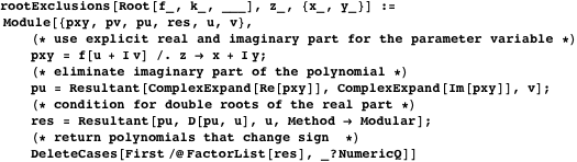 A discontinuity of a Root object occurs due to a switch in the root numbering. This in turn results from coinciding real parts of different roots. At the point where two roots have a common real part, the real part must have a double root. So carrying out the two resultant calculations gives a sufficient set of algebraic curves along which the roots will exhibit discontinuities.