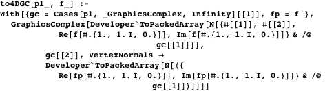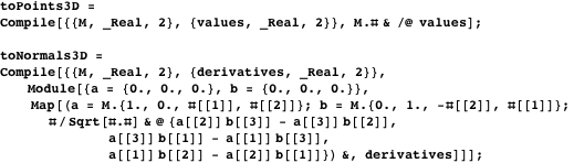 projection matrix, this is straightforward for the vertices and not too difficult for the normals. Fortunately, having the information of the embedded hypersurface in 4D allows a projection with normals in 3D using the Cauchy-Riemann conditions, which will result in a smooth-looking surface. Because we will use the final function interactively, we use Compile to carry out the calculation of the 3D vertex coordinates and the 3D normals as efficiently as possible.