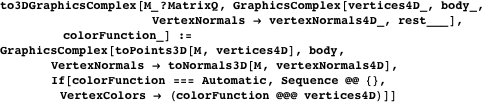 The function to3DGraphicsComplex carries out the projection from 4D to 3D.