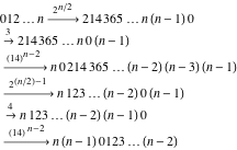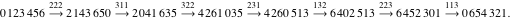 Although useful, this result gives a large upper bound for the solution. For instance, instead of the 21 movements required to get from 0123456 to 0654321, we need 43 by using Theorem 8. Just to appreciate the subtleties involved, let us consider the steps used in applying one of the shortest solutions 222311322231132223113: