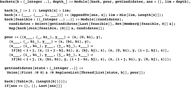 The following code generalizes our problem to that of obtaining 1 liter from handling a number of buckets of given capacities.