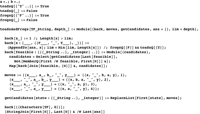 Function toadsAndFrogs takes a string describing a starting state and attempts to find a solution to the problem of swapping the positions of the frogs and toads. As in the Problem of the Buckets, it makes use of backtrack to traverse the state space up to a given depth.