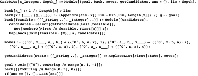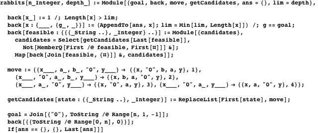 , which renders a trial-and-error approach impractical. The following function rabbits adapts our backtrack paradigm to this problem. Given the number