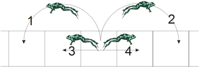 In order to describe a solution, we can regard each stage as a movement of the vacant square; this allows us to unambiguously recover the positions of all the pets at each stage and focus on the essential characteristics of the problem. Let us denote jumps to the left and right and moves to the left and right performed by the empty square by the digits 1, 2, 3, and 4, respectively (see Figure 2). Then the solution previously given for the case