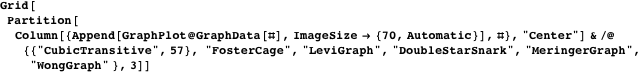 GraphData is an extensive built-in data paclet included with Mathematica 7 [8]. It contains more than 3000 graphs, in excess of 200 graph properties, and one or more attractive embeddings for most of its constituent graphs. GraphData has been painstakingly compiled by Eric Weisstein and myself making use of extensive Mathematica computations, programming, hand-drawings, careful mining of the graph theoretic literature, and feedback from a number of prominent graph theorists. (If you have any additions to suggest for GraphData, please feel free to email them to eww@wolfram.com.) For example, here are a few 30-vertex graphs from