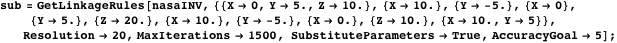 The defined mechanism contains two loops, displayed with red dotted lines in Figure 2. The loop-closing constraint equations constrain the joint variables that were independent before. The independent joint variables of the mechanism are stored in the $DrivingVariables record of the LinkageData, while the implicitly defined (or constrained) joint variables are stored in the $DerivedParametersB record. Both records store the variable names and their actual substitution values. The $DerivedParametersB record also stores the constraint equations to be solved.