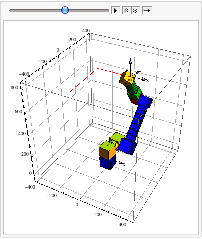 Plug in the calculated joint variables of the original (direct manipulator) to visually check the result of the calculation (to minimize the size of the notebook, only every tenth interpolation point is used in the animation).